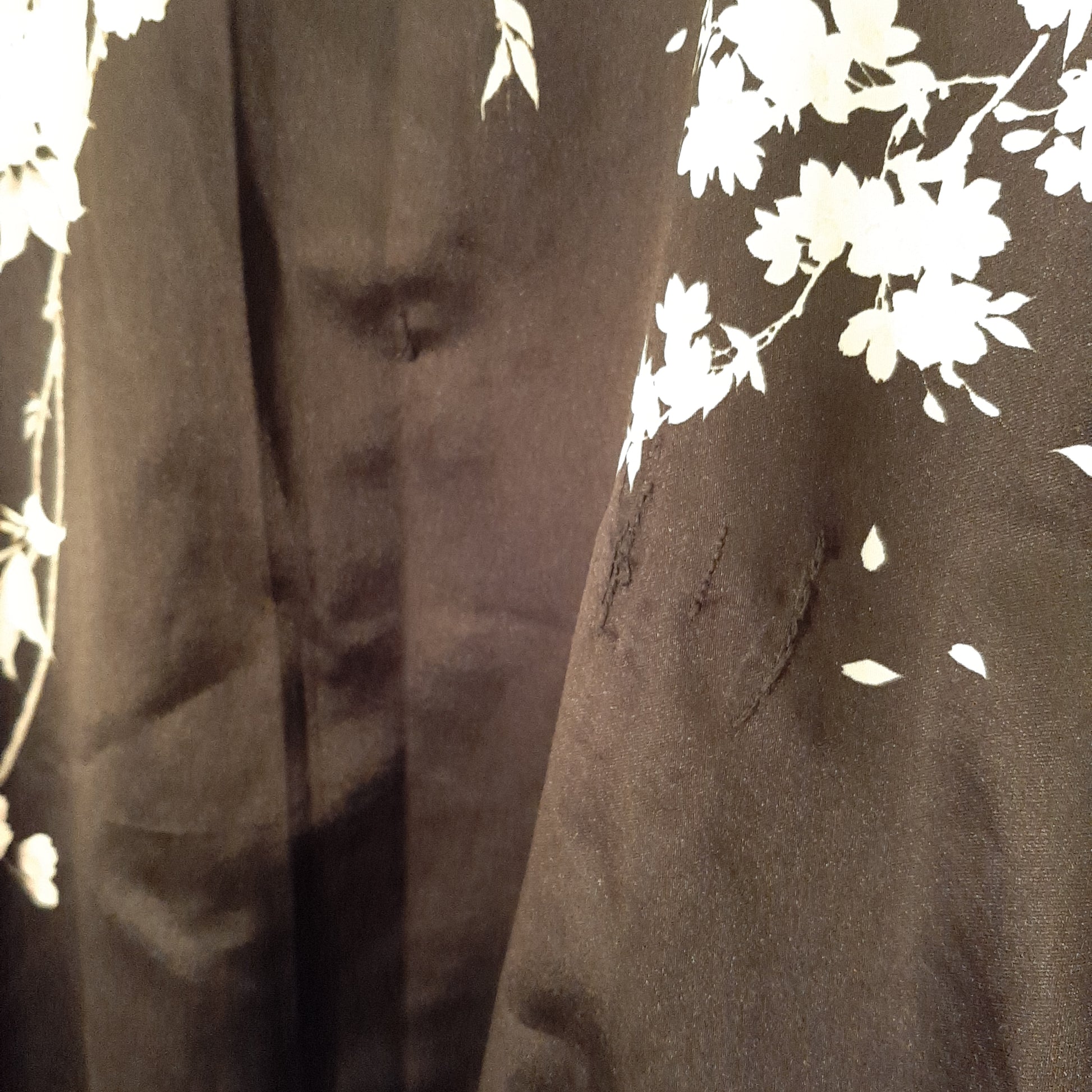 ~ Black robe with cherry blossom design. There is no label but the robe has several design features of a kimono or yukata including the collar and sleeve style ~