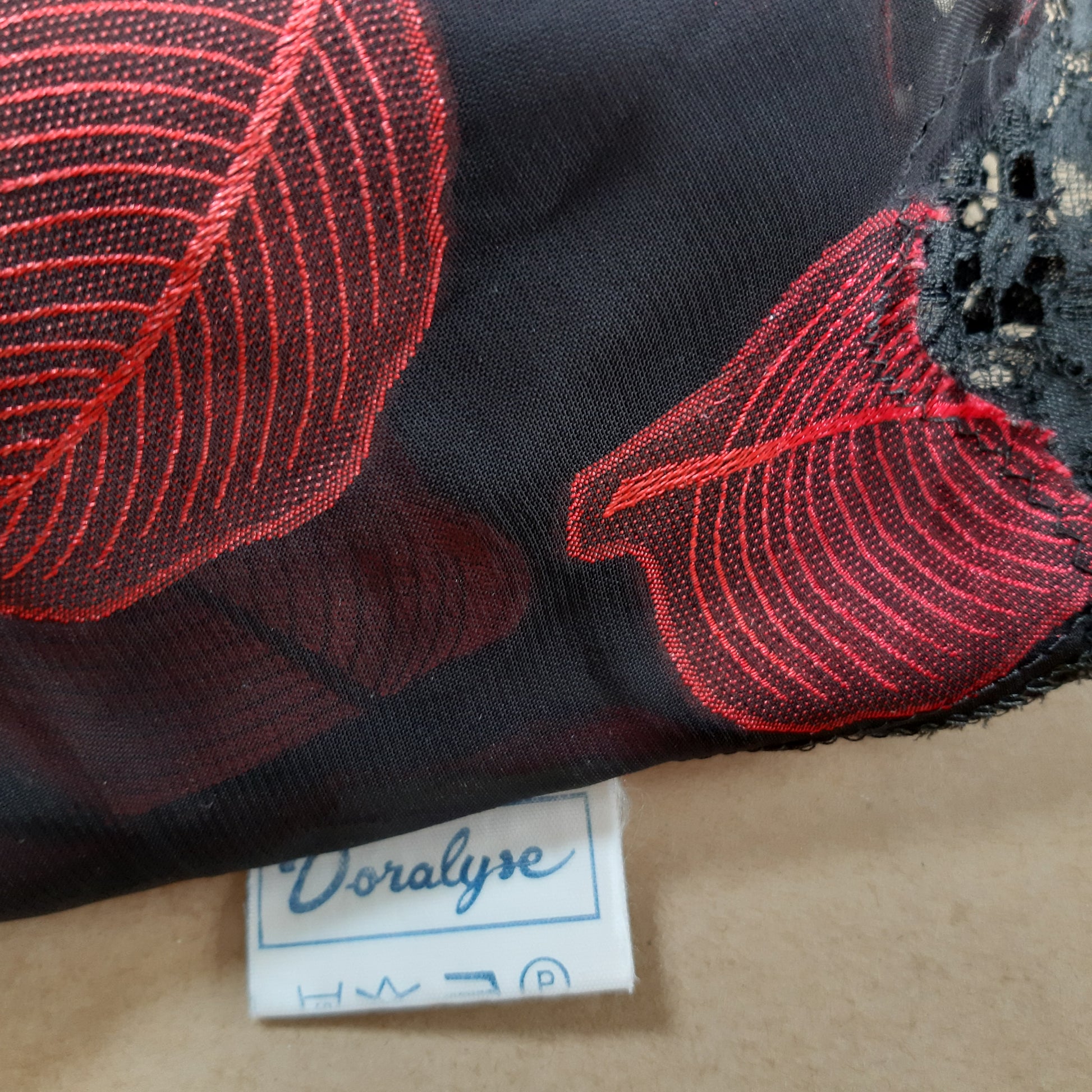 A black Doralyse bralette with a red button up front and a red leaf pattern.