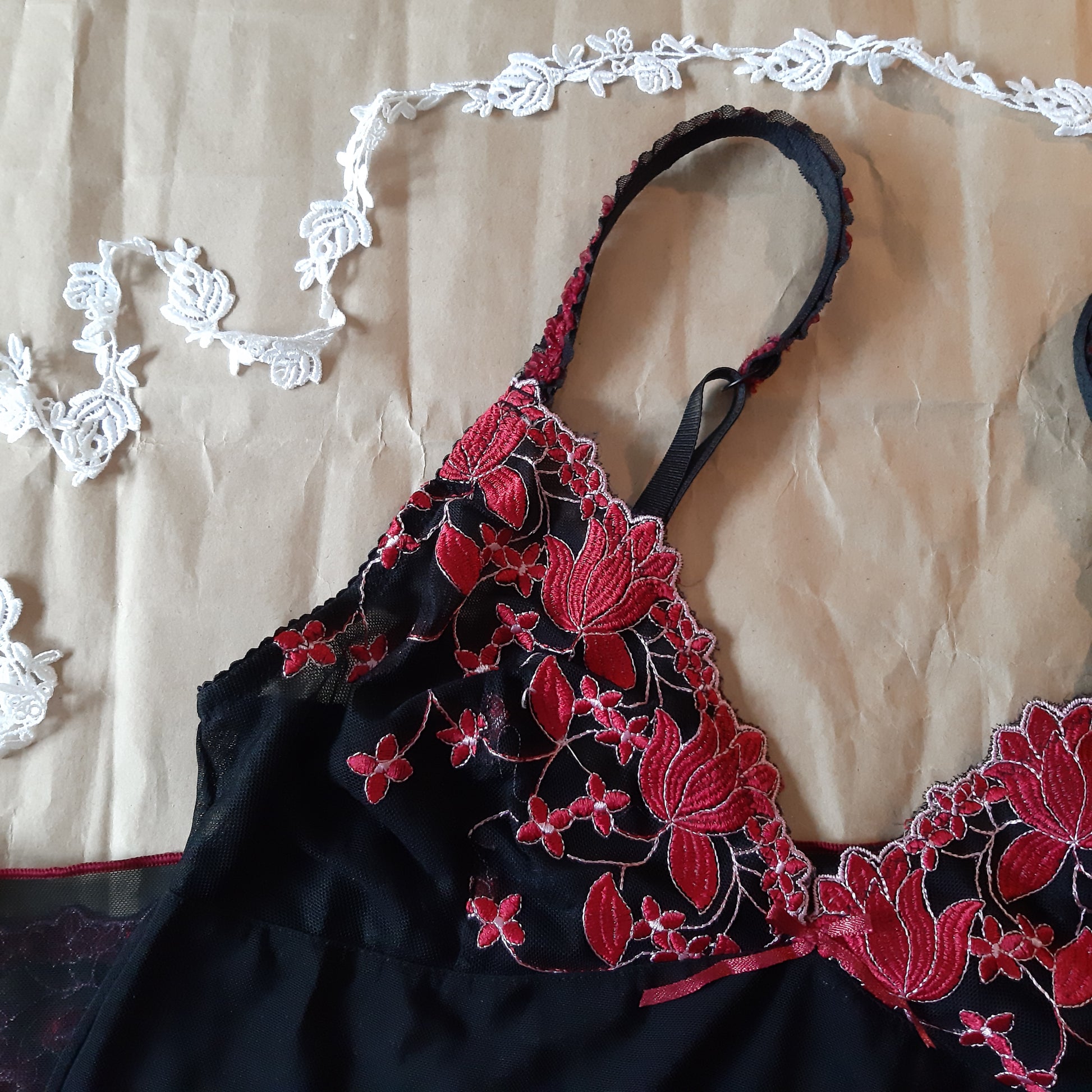 ~ Black slip with red tulip floral design, beaded straps and lettuce edged seams ~