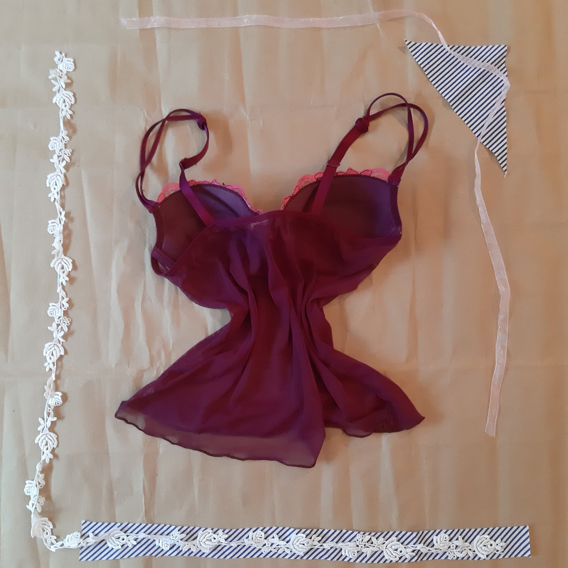 ~ Plum camisole with mulberry floral embellishments, underwire cups and lettuce edged hem ~