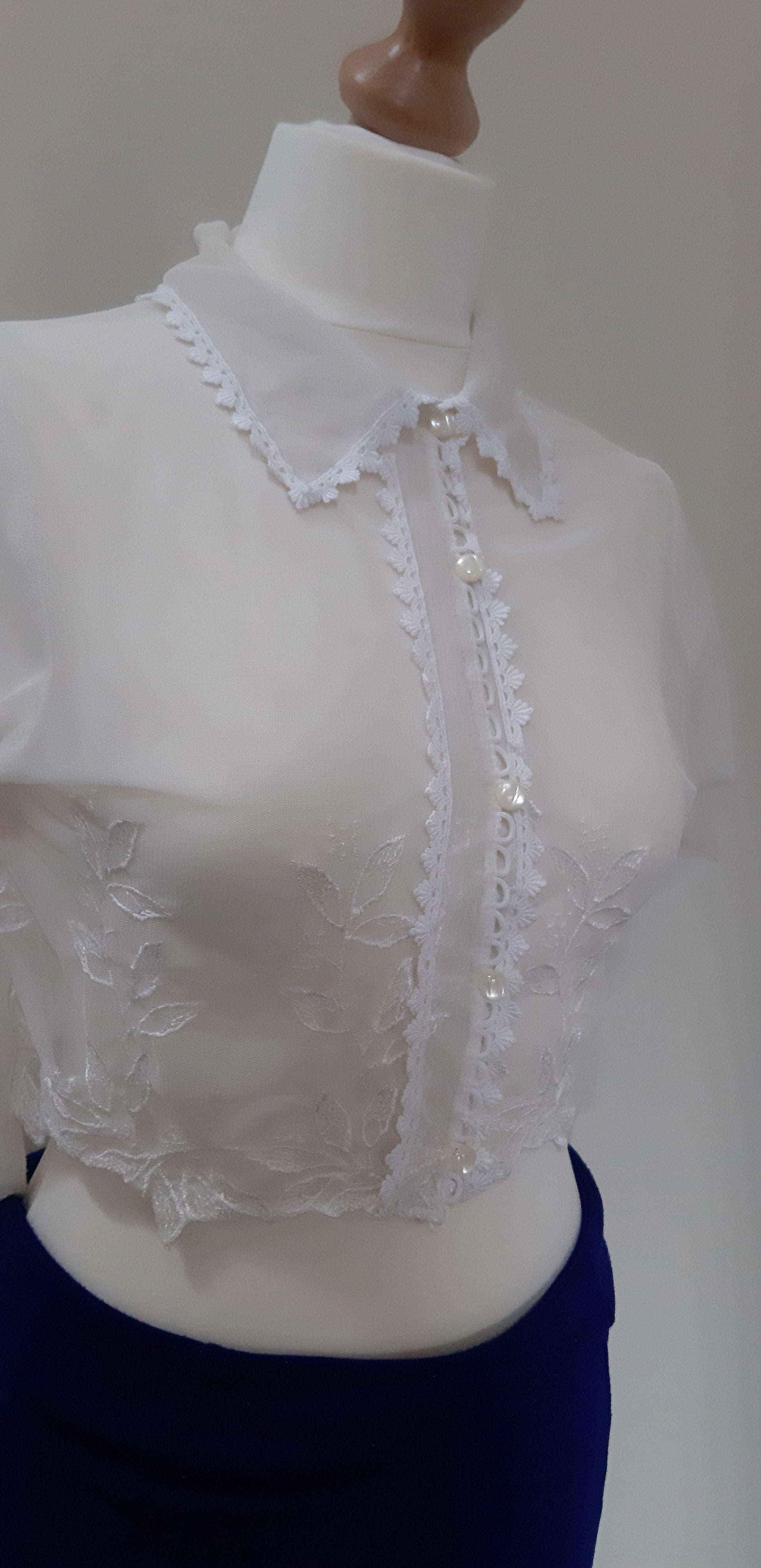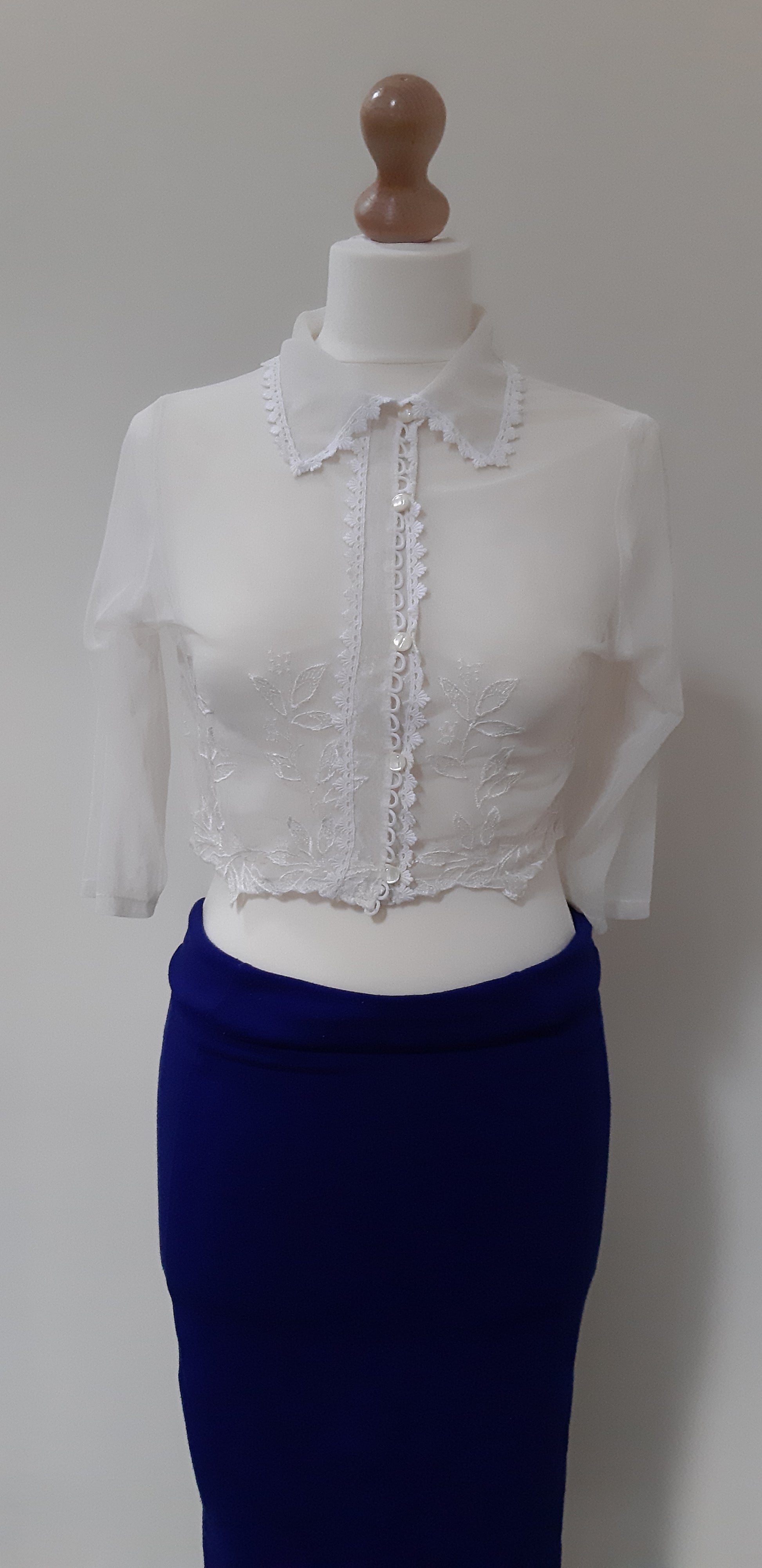 Vanilla Bolero with white embroidery which can be worn as boudoir. Elbow length sleeves with soft embroidered collar.